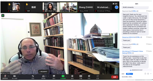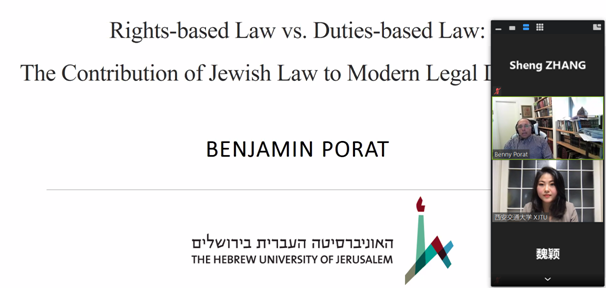 2021年9月29日下午,新丝路uwin电竞官网联盟“院长论坛”第二讲成功举办。希伯来大学uwin电竞官网副院长Benjamin Porat教授为联盟25所院校师生以及丝绸之路大学联盟的师生带来了题为“Rights-based Law vs Duties-based Law: The Contribution of Jewish Law to Modern Legal Discourse”的线上讲座。讲座由uwin电竞官网uwin电竞官网助理教授郭剑萍主持。