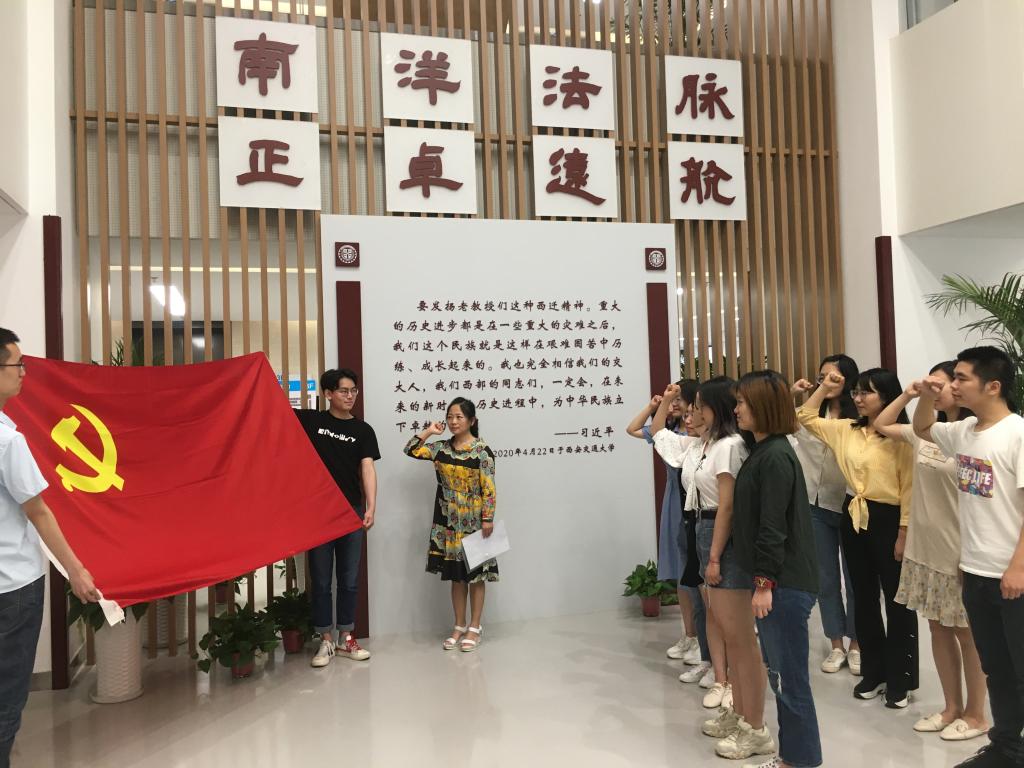 随后,在法学研究院三楼中厅举行了丛珊等9名同志的入党宣誓仪式。由学院党总支委员、学生工作专职委员张乃钟同志领誓,9名同志面对鲜红党旗庄严宣誓。宣誓完毕后,张乃钟老师亲手为9名同志一一带上党徽,她向新入党的同志表达了衷心的祝贺,向大家强调入党这一天是人生中最为重要的日子之一,大家一定要牢记在心,同时鼓励新党员同志以后要更加严格地要求自己,发挥好党员的先锋模范作用,争当先进表率!