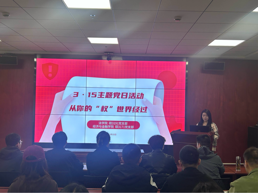 每年的3月15日,是由国际消费者联盟组织于1983年确定的国际消费者权益日(World Consumer Rights Day)。为提高同学们对消费者权益保护的认识,增强其在消费中利用法律手段维护自身权益的意识和能力,uwin电竞官网硕3191党支部联合经济与金融学院硕3171党支部,于3月15日19:00在创新港校区涵英楼3001教室开展3·15主题党日活动。本次活动由uwin电竞官网硕3191党支部书记刘芮言主持,活动主要内容为消费者侵权研究分享。