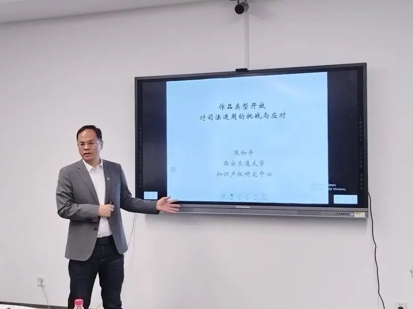 知识产权研究中心党支部书记焦和平教授作了《作品类型开放对司法适用的挑战与应对》主题分享,通过对新《著作权法》关于作品类型开放规定的解读,揭示了作品类型开放面临的司法适用挑战,并结合“音乐喷泉案”“AI文生图著作权侵权第一案”等案提出了法官适用作品类型开放条款的具体方法和步骤。