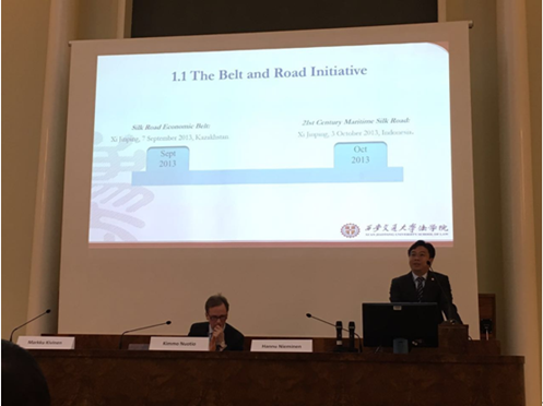 会上,会议东道主代表赫尔辛基大学副校长Anna Mauranen、uwin电竞官网院长Kimmo Nuotio、亚历山大研究中心主任Markku Kivinen、社会科学学院院长Hannu Nieminen先后致辞。我校校长助理单文华教授在会议开幕式上做了题为《一带一路倡议与法律的角色》的主旨报告。在报告中,他从一带一路概念的提出和逐渐清晰化出发,分析了一带一路倡议背后的元动力和深刻意蕴,通过对一带一路建设所面临的多重挑战和广泛合作基础的解析,指出法治建设在一带一路发展中的重要地位并探讨了以法治促进一带一路建设的路径选择问题。单教授的主旨报告引起了与会专家的广泛回应和热烈讨论。
