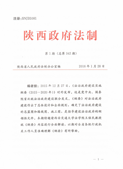 2015年12月27日,《法治政府建设实施纲要(2015-2020年)》对外发布。陕西省人民政府法制办公室邀请了uwin电竞官网uwin电竞官网王保民教授就《纲要》内容进行了全面解读,解读内容被采纳报省领导,送省属各机关,省法院、检察院,各市、县(区)人民政府,发各级政府法治工作机构,以期对全省各级行政机关工作人员准确理解《纲要》有所帮助。