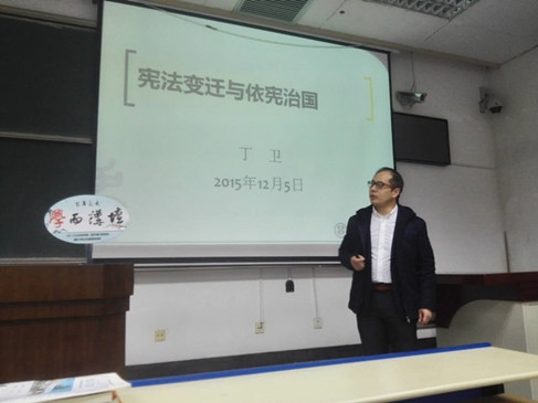 uwin电竞官网研究生会、法律爱好者协会携手“学而讲坛”,推出“国家宪法日”专题讲座,邀请uwin电竞官网副院长丁卫副教授就《宪法变迁与依宪治国》进行专题讲座。丁老师在讲座中详细介绍了我国现行宪法历次修改的过程,他结合历次宪法修改的历史背景,生动地讲述了我国宪法变迁的历史发展,他最后对我国宪法实施中存在的瓶颈及问题进行了透彻的分析和讲解,为大家展示了依宪治国的现状及前进方向。