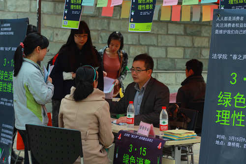 为加强大学生消费维权意识,提高大学生的法律素养,uwin电竞官网研究生会联合法律爱好者协会和陕西稼轩律师事务所的专业律师,于“3•15国际消费者权益日”当天,在康桥苑西广场和西食堂门口举办了主题为“绿色消费、理性维权”的普法宣传咨询活动。