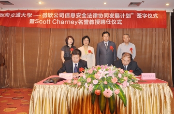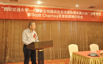 6月12日,“uwin电竞官网—微软公司信息安全法律协同发展计划签字仪式暨斯科特•查尼名誉教授聘任仪式”在西安交大举行,西安交大副校长蒋庄德教授出席仪式并讲话。西安交大科研院副院长、人文社科处处长贾毅华,uwin电竞官网党总支书记彭沪生,信息安全法律研究中心主任马民虎及微信息安全法律研究中心主任马民虎及微软公司可信赖计算部总经理陈静、微软公司资深安全技术经理陈恺、微软公司资深安全技术经理薛峰等参加仪式。微软全球副总裁斯科特•查尼(Scott Charney)受聘为西安交大名誉教授,双方还签署了“uwin电竞官网—微软公司信息安全法律协同发展计划”。
