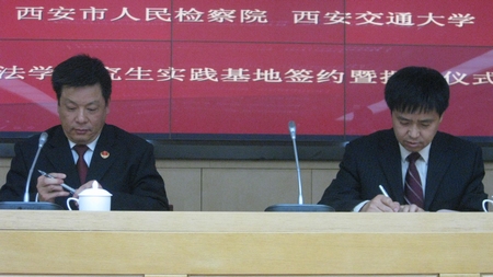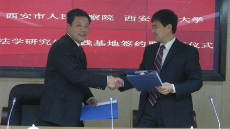 uwin电竞官网法学研究生实践基地签约暨揭牌仪式,于2009年11月25日上午10点,在西安市人民检察院新址办公大楼内举行。“uwin电竞官网法学研究生实践基地”是uwin电竞官网和西安市人民检察院,教学与实践相结合的平台,其宗旨在于提升我校法学研究生的法律实践能力,并强化检察院司法人才的理论素养。