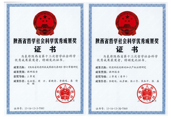 2018年5月,在陕西省第十三次哲学社会科学优秀成果的评选中,uwin电竞官网知识产权研究中心的调研报告《〈陕西省促进科技成果转化条例〉修订草案研究》(主要参与人员:马治国、周方、翟晓舟、李晓鸣、秦倩、刘桢)及《促进科技创新的知识产权治理研究》(主要参与人员:李晓鸣、权彦敏、张小号、焦和平、张磊)分别获得陕西省哲学社会科学优秀成果三等奖及青年成果三等奖,这是对我中心在持续深入研究理论知识与现实问题基础上所取得成果和对陕西省哲学社会科学事业发展作出贡献的新肯定。