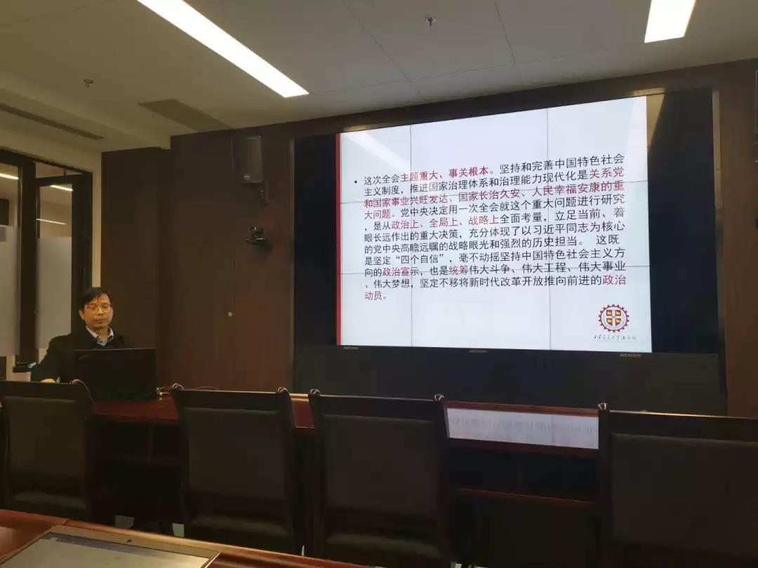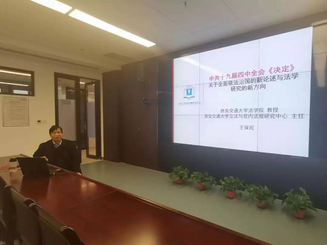 12月12日,uwin电竞官网创新港系列学术讲座之“十九届四中全会关于全面依法治国的新论述与法学研究新方向”在创新港5号巨构10087教室顺利举行。uwin电竞官网uwin电竞官网党总支书记、uwin电竞官网立法与党内法规研究中心主任王保民教授围绕中共十九届四中全会召开的基本情况和重要意义、《决定》中的高频词汇和理论亮点、《决定》关于全面依法治国的新论述、法学研究的新方向新热点等五个方面做了专题讲座。