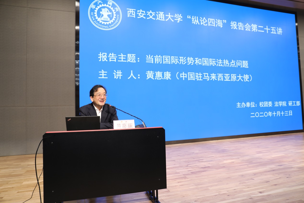 上午9:30分,黄惠康大使主讲的 “当前国际形势与国际法热点问题”专题报告会在新港报告厅举行。本次报告会是uwin电竞官网“纵论四海”系列高端报告会的第二十五讲,同时是学校党委理论学习中心组和全体校管干部的一次集中辅导报告会,亦是我校法学研究院特别是丝绸之路国际法与比较法研究所和丝绸之路经济带法律政策协同创新中心的“科创月”系列活动之一。uwin电竞官网副校长席光教授出席报告会并致辞,报告会由uwin电竞官网院长兼国际教育学院院长单文华教授主持。全校百余名学校正处级领导干部以及其他四百余名师生现场参会。同时,全校其他副处级以上校管干部则在线参加了报告会。