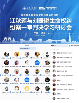 2022年1月16日下午,由uwin电竞官网民商法研究所主办的“江秋莲与刘暖曦生命权纠纷案一审判决学习研讨会”在腾讯会议平台成功举行。此次学习研讨会由uwin电竞官网uwin电竞官网民商法研究所副教授聂卫锋全程主持。来自北京航空航天大学、西南大学、西南财经大学、浙江工商大学、成都理工大学、东南大学、中国政法大学、中国人民公安大学、西北大学、西南政法大学、西北政法大学、郑州大学、河南大学、西北师范大学以及uwin电竞官网等20余所高校和多家律师事务所的共计超过160名老师、律师和同学参与了本次研讨会。
