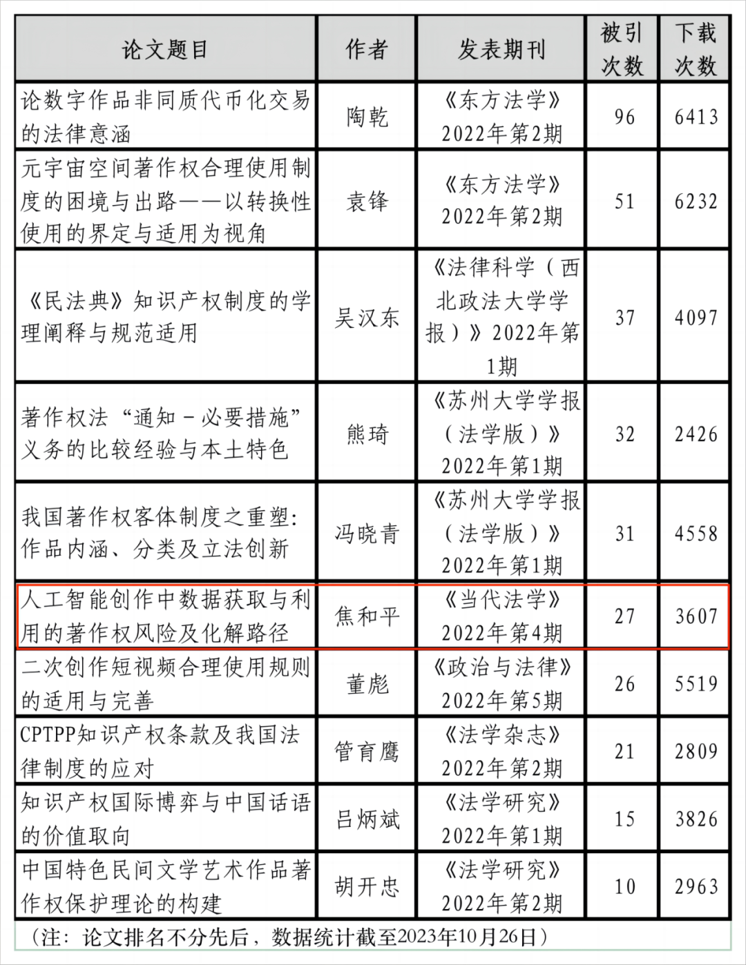 2023年11月10日,中国人民大学国家版权贸易基地公布了“2022年度著作权热点问题研究十佳论文”。uwin电竞官网uwin电竞官网教授、博士生导师焦和平发表于《当代法学》2022年第4期的《人工智能创作中数据获取与利用的著作权风险及化解路径》入选十佳论文。
