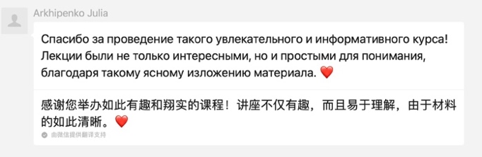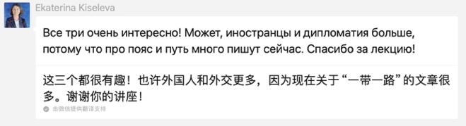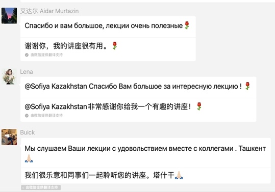 从筹办本次讲座伊始,索菲亚教授就在学院官网发布了讲座通知,并建立了微信群以便于与参会人员及时沟通和交流。每次开课前,苏菲亚教授都会在群里提醒大家入会听课;每次讲座结束后,索菲亚教授还会无偿地在群里向大家分享讲座课件。生动有趣的讲课氛围、鞭辟入里的内容讲解让索菲亚教授的课程收获了大量来自参会者的好评与点赞(下附部分参会者课程好评截图)。