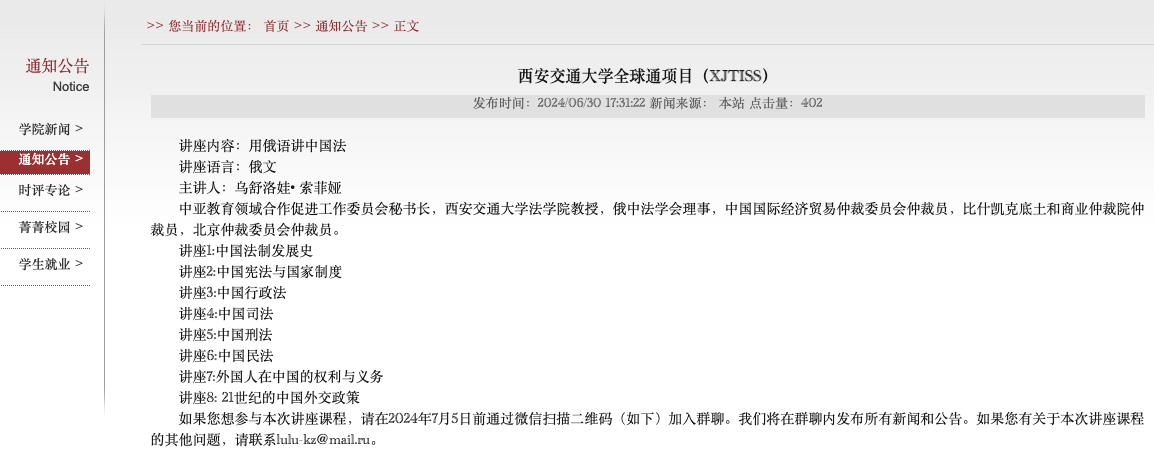 为推进我校教育国际化进程,扩大各专业国际化培养人才力度,进一步增强我校国际竞争力和影响力,为本科生国际化提供优质教学资源,由学校教务处牵头,国际处、国际教育学院、网络学院等校内多部门及相关学院联合举办的西交·通全球暑期(Summer School)项目在2024年暑期如期展开。立足学院师资实际和学科特色,我院哈萨克斯坦籍教授——索菲亚·乌舒洛娃于2024年7月初至月底筹办开展了为期近一个月的主题为——“用俄语讲中国法”系列讲座活动。该课程全程以俄语授课,吸引了来自哈萨克斯坦、吉尔吉斯斯坦、乌兹别克斯坦、塔吉克斯坦、土库曼斯坦、俄罗斯、白俄罗斯和乌克兰等主要俄语语系国家以及部分在华留学学生800余人次参加。参会人员既有高校的教师和学生、律师和公证员,也有来自旅游、物流、建筑工业公司和医院等机构的高级管理人员和法务。