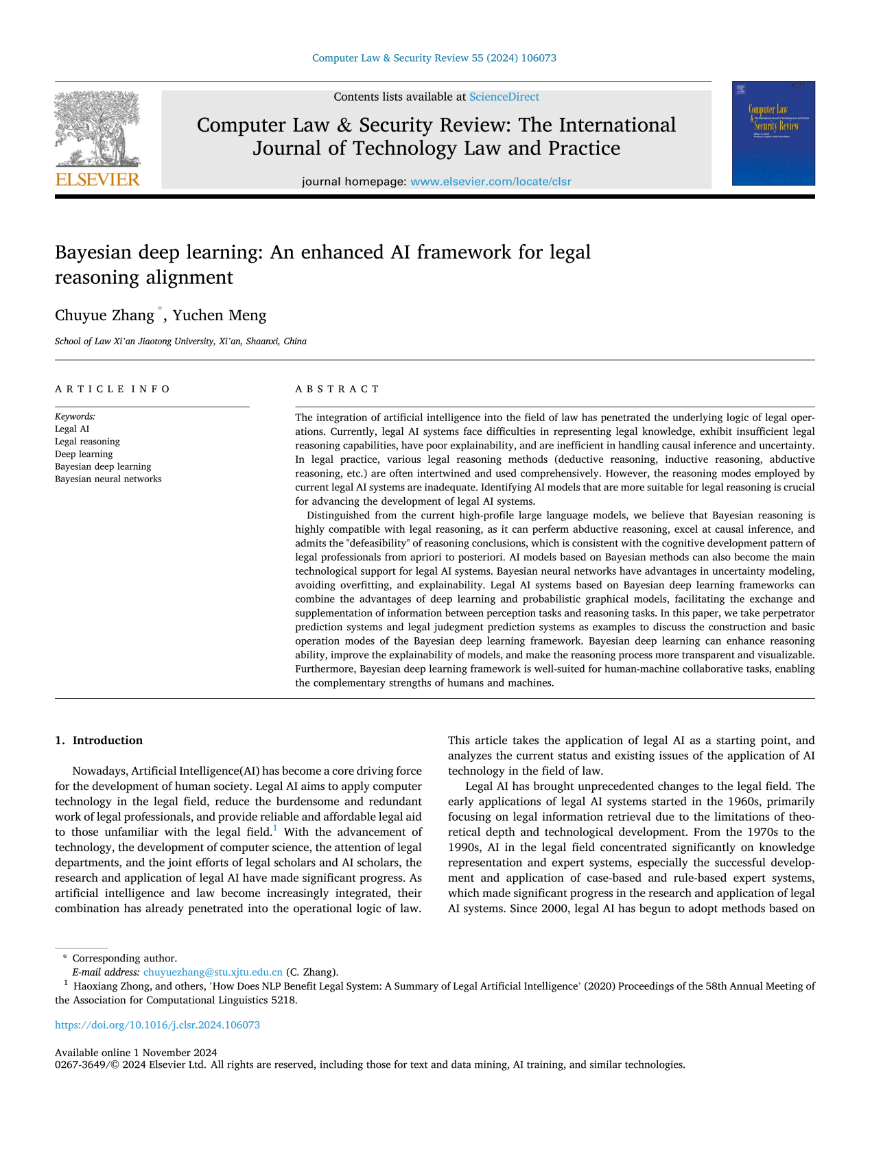 近日,uwin电竞官网人工智能与信息安全法律研究中心刘东亮教授指导的博士研究生张楚悦、孟宇辰在SSCI一区期刊《计算机法律与安全评论》(Computer Law & Security Review , Volume 55, November 2024)上发表论文《贝叶斯深度学习:与法律推理相协调的增强型人工智能框架》(Bayesian Deep Learning: An Enhanced AI Framework for Legal Reasoning Alignment)。