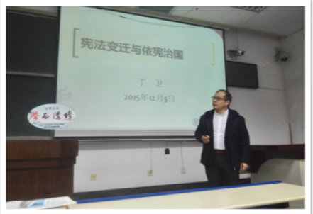 uwin电竞官网研究生会、法律爱好者协会携手“学而讲坛”,推出“国家宪法日”专题讲座,邀请uwin电竞官网副院长丁卫副教授就《宪法变迁与依宪治国》进行专题讲座。丁老师在讲座中详细介绍了我国现行宪法历次修改的过程,他结合历次宪法修改的历史背景,生动地讲述了我国宪法变迁的历史发展,他最后对我国宪法实施中存在的瓶颈及问题进行了透彻的分析和讲解,为大家展示了依宪治国的现状及前进方向。