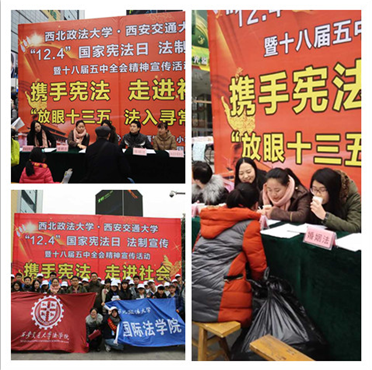 让守宪成为国民每天的生活方式”是实现法治中国建设的基本保障。为了普及宪法知识,推动全社会知法、用法、守法、护法意识的形成,uwin电竞官网uwin电竞官网与西北政法大学国际uwin电竞官网共同在西安市雁塔区飞炫广场举办了主题为“法入千万家”普法宣传活动,通过分发法律宣传单、法律意识调查问卷、法律咨询、普法广播等形式,吸引了大批市民的关注。在法律咨询服务点,许多市民前来咨询,咨询内容涉及婚姻法、劳动合同法、民法等领域,包括离婚财产分配、离婚孩子抚养权归属、追讨薪资、借款追债等与大家生活密切相关的问题,咨询点的同学认真对待每一位前来咨询的市民,耐心回答他们的问题,赢得了一致好评。