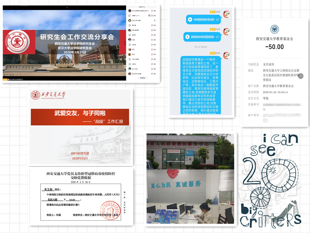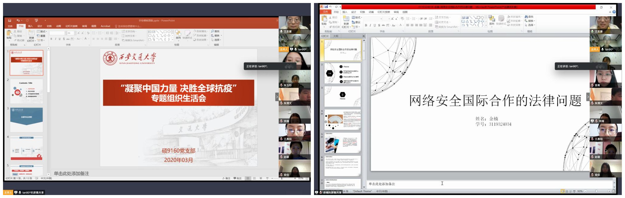 3月23日晚,西安交大uwin电竞官网与武汉大学uwin电竞官网联合举办“武爱交友,与子同袍”分享交流会,朱博文、孙阳分别就研会建设、支部工作与武大同学分享心得、畅谈经验,两校法科学子对近期“抗疫”工作展开热烈讨论。“武大uwin电竞官网研会组织健全完善,活动丰富多彩,各位同学的分享干货满满,令人受益匪浅”,支部党员、uwin电竞官网研会主席朱博文表示,“我们将组织专题研究,吸收借鉴有益经验,更好地为交大同学们服务”。“武大医学部白衣执甲、坚守阵地,交大医学部逆行出征、千里驰援,共同凝聚起抗击疫情的钢铁长城”,孙阳在总结发言中表示,“待疫情散去、山河无恙之时,希望大家可以实地交流,轻抚兴庆湖畔的秦砖汉瓦,品味珞珈山上的荆风楚韵。”
