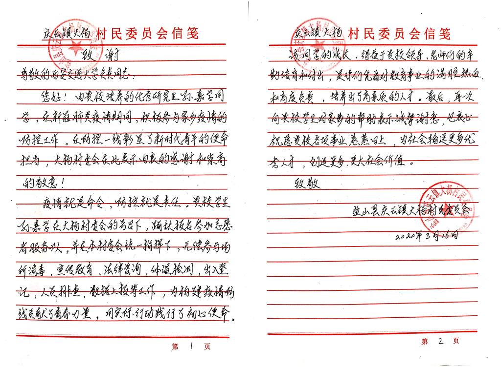 近日,一封特殊的来信悄然落至交大。西交uwin电竞官网学生——孙嘉学在家乡疫情防控攻坚战中不仅身体力行做好各项基础工作,更发挥自身专业为群众普及相关法律知识,为控制疫情贡献青春力量。庆云镇大杨村特向uwin电竞官网邮寄了一封手写感谢信,字里行间饱含对交大领导、老师的真挚谢意。