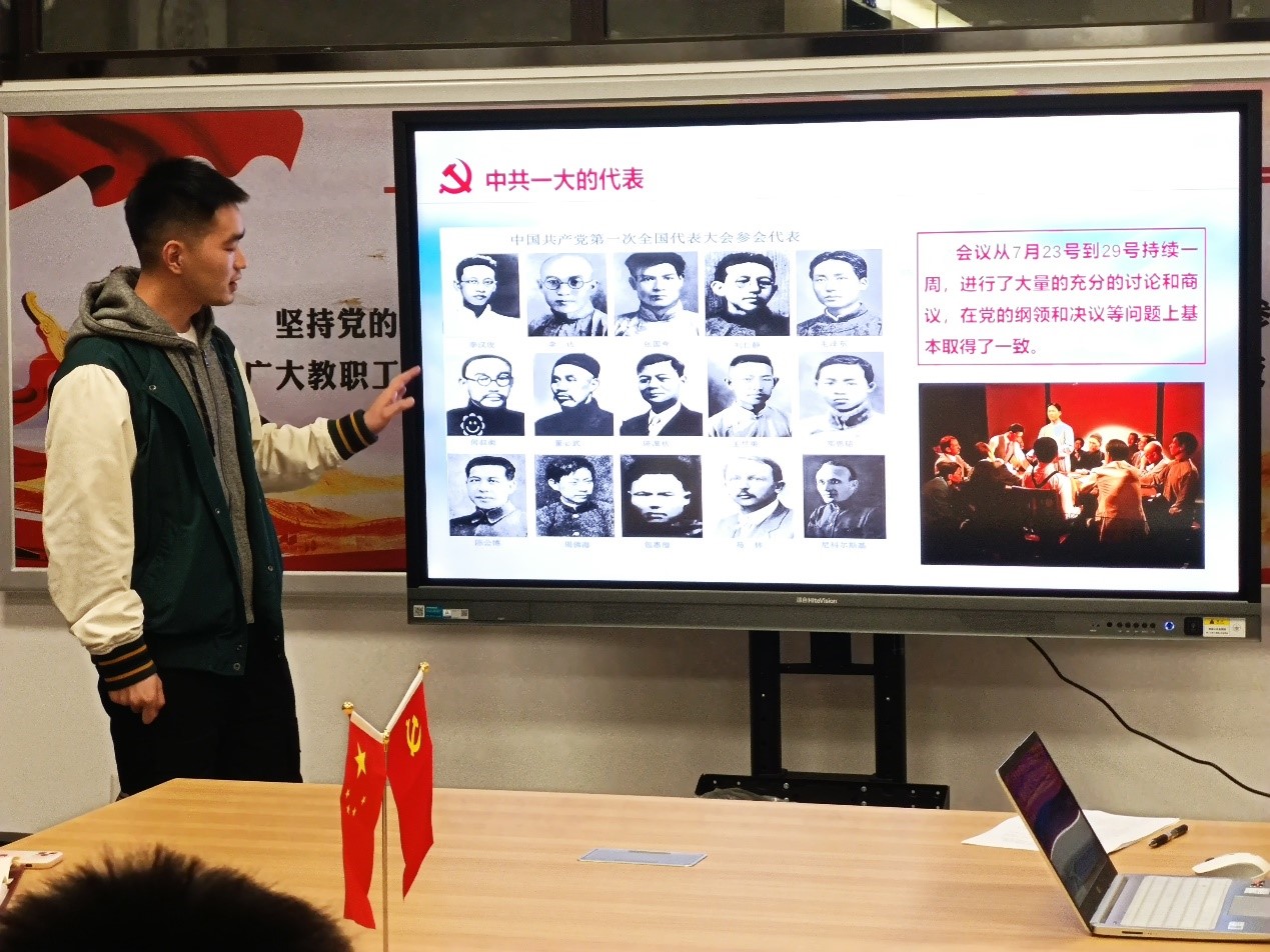 张雷奇同志从浙江嘉兴南湖这艘小船之“红”引入,介绍红船的红色来历。又以红船为连接,谈到与之密不可分的党的第一次全国代表大会,详细介绍大会成员、大会前后时间及地点变动,以及发生在其中的惊险而又体现革命智慧的党的故事。在紧随其后的党的名称、建党节的来历等讲解中,张雷奇同志结合生动的故事和感人至深的情节调动起与会党团员的参与积极性,在丰富与会党团员有关党的理论储备的同时,激发大家热烈的讨论。