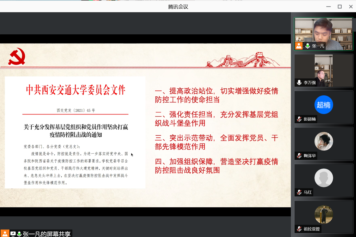 12月31日上午,uwin电竞官网硕1173党支部召开线上组织生活会,深入学习落实上级党委关于疫情防控的相关文件精神。党支部成员及入党积极分子代表共计15人参与本次会议,uwin电竞官网副院长李万强教授出席。会议由党支部书记张一凡主持。
