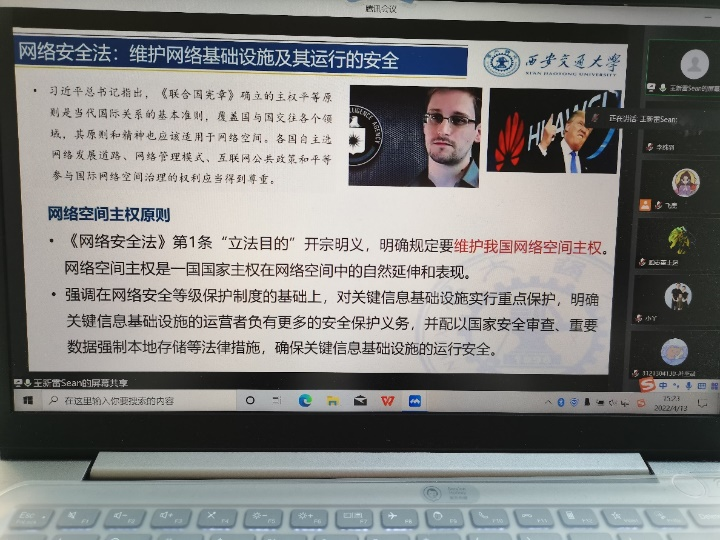 4月13日,uwin电竞官网组织各党支部一同观看uwin电竞官网全民国家安全教育普法讲座。由于疫情原因,本次讲座采取线上模式。讲座中,王新雷老师对“新时代我国数据安全、隐私保护的法律成就与个人担当”这一专题进行详细讲解,各位同学都获益匪浅。