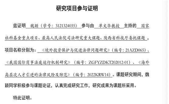魏颖参与了导师单文华教授主持的多项推进涉外法治建设的重要课题。其中,最高人民法院司法研究重大课题《我国国际商事法庭运行机制研究》被评为“最高人民法院2020年度司法研究重大课题优秀课题研究成果”,受到最高人民法院党组书记、院长周强同志批示肯定。